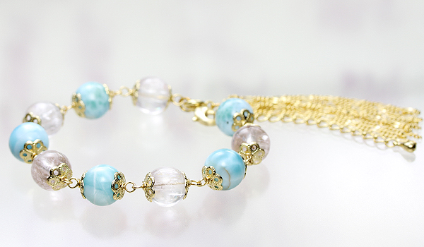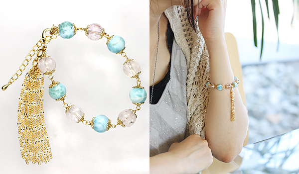 ラリマーとクンツァイトを一珠一珠、アートワイヤーで丁寧に繋いだ、パステルカラーが可愛らしいブレスレットです。