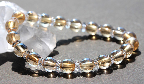 淡い黄金色の輝きが美しいゴールデンオーラと、水晶の平カットとを交互に紡いだ、シンプルデザインのブレスレットです。