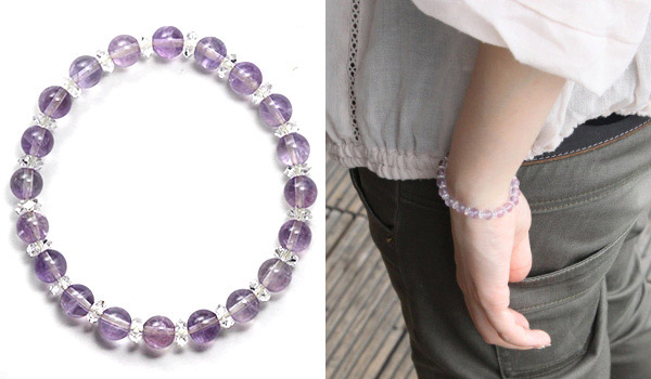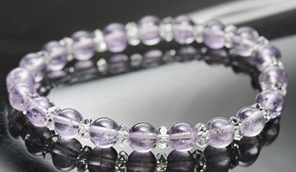 標準的なアメジストの色合いと比べると軽やかな印象の、繊細で可憐なラベンダーカラーはうっとりするほどに美しく、水晶の小さなカットビーズがキラキラと光を反射してブレスレットにさらに輝きを添えます。