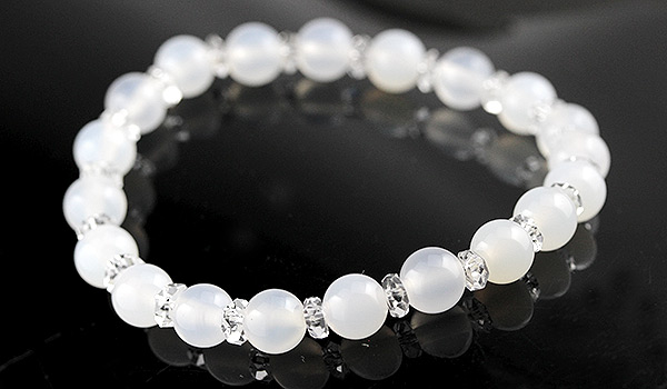 ほんのりと透明感のある乳白色の輝きが美しいホワイトカルセドニーと、水晶の平カットとを交互に紡いだ、シンプルデザインのブレスレットです。
