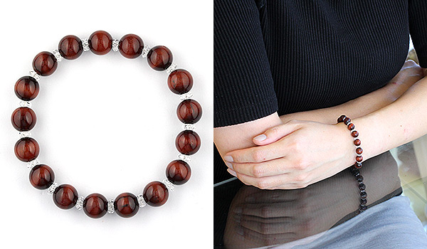 スタンダードな黄色のタイガーアイが酸化することで、深みのある上品な色合いとなったレッドタイガーアイに、水晶の小さなカットビーズがキラキラと光を反射して輝きを添えます。