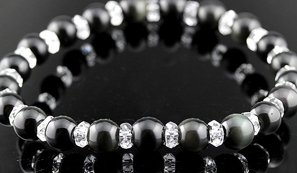 ただの真っ黒い石にしか見えないのに、光を当てる角度によってうっすらと別の色が浮かぶという、不思議な美しさを持つレインボーオブシディアンを使用したブレスレットをご紹介します。