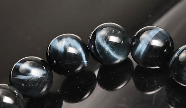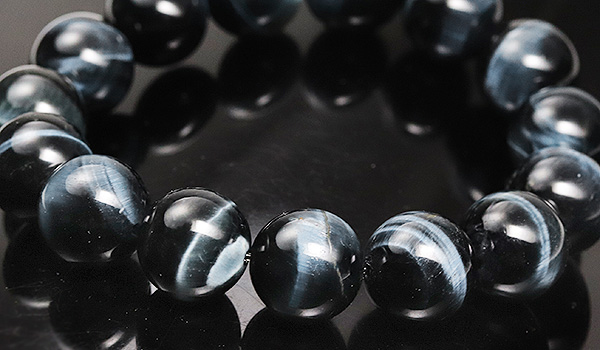 一見するとオニキスのような真っ黒に思える石、しかし光を当てる角度によって表情は一変し、青色の光沢が幻想的に浮かび上がるブルータイガーアイ。