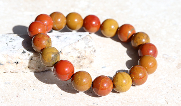 朱赤色や黄褐色といった、秋になり紅葉で色づいた葉を思わす色合いがしみじみとした美しさを感じさせる”佐渡赤玉石”が、素通しブレスレットとして