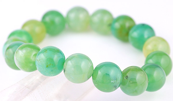 今回のブレスレットに使用していますのは、はっきりと鮮やかなグリーンや黄みがかったマスカットグリーン、エメラルドのようなグリーンやうっすら青みがかったグリーンといった、1珠ごとに少しずつ異なるグリーンの色合いが見事なジェムシリカ。