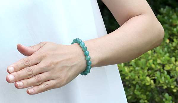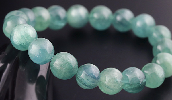 産地が限定されるために、非常に希少なグリーンカラーのカイヤナイトの8.5〜9mm玉を使用したブレスレットが、
