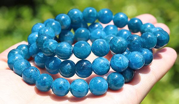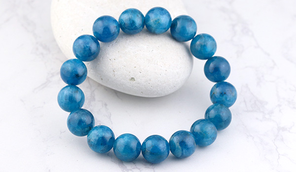 深みを感じる濃い青色が目を引く、ブルーアパタイトの10mm珠をつないだブレスレットです。