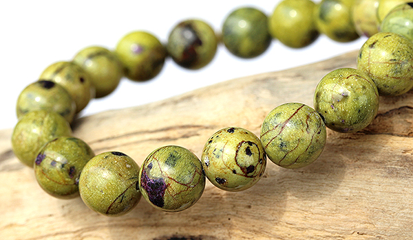 明るいオリーブグリーンの色合いをベースに、黒っぽく見えるほど濃い紫色がライン状や斑点状の模様を描く個性的な見た目の石、アトランティサイトが実に久々に入荷できました!