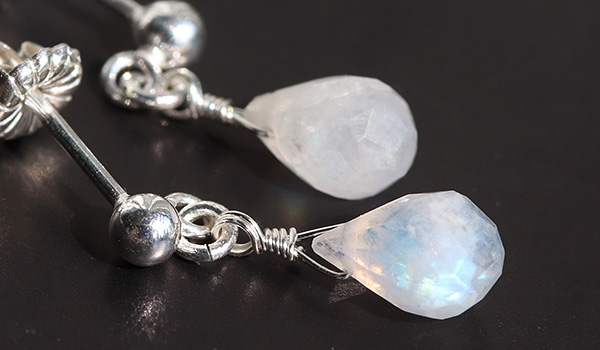 今回使用しているレインボームーンストーンには、表面に多数の細やかなファセットを磨き上げていますので、ピアスが揺らめくたびに