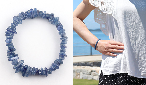 爽やかな雰囲気になるカイヤナイトのさざれパーツを素通しにしたブレスレットです。