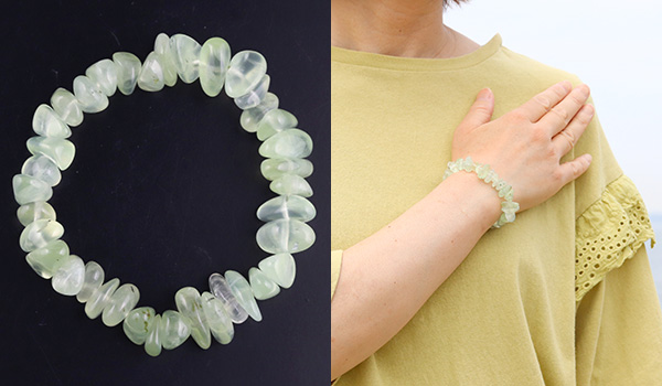 ●マスカットゼリーのような発色と質感が特徴的な、プレナイトのさざれを使用したブレスレット