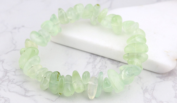 淡い黄緑色で、潤んだような質感と柔らかな透明感がある、まるでマスカットゼリーのような見た目がキュートな、プレナイトのさざれパーツを素通しにしたブレスレットです。