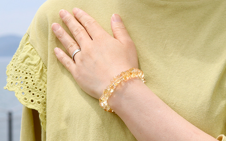 ●光をそのまま閉じ込めたかのような、淡い発色と透明感が美しいシトリンのさざれを使用したブレスレット