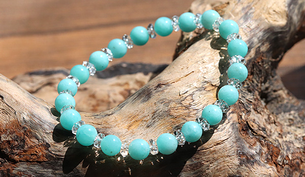 爽やかな色合いが美しいペルー産のアマゾナイトと水晶の平カットとを交互に紡いだ、シンプルデザインのブレスレットです。