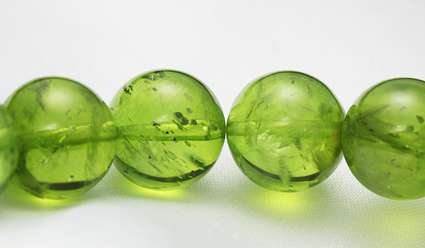 金色の光を内に閉じ込めたような美しい色合いに、まばゆく照り輝く光沢感、そして透明度も申し分なしという、まさに三拍子そろった大粒のペリドットを、素通しのブレスレットにしてご紹介します。