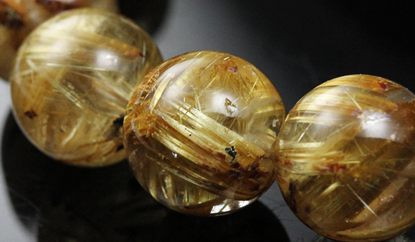 深みを帯びた黄金色のルチルが、光を反射して目にも鮮やかな輝きを放つ、