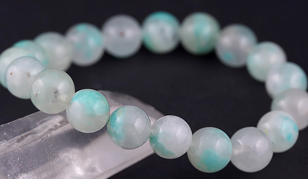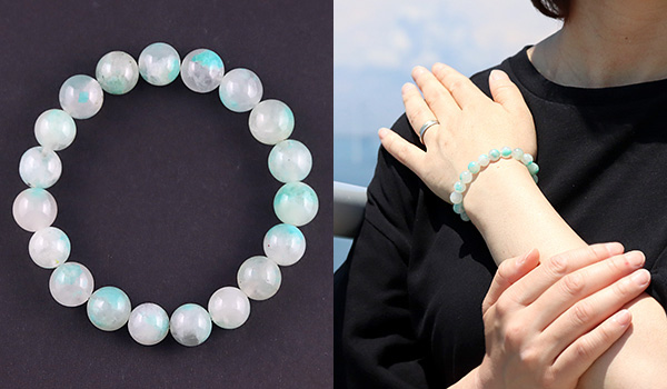 珠ごとに水晶とアマゾナイトの分量が異なるため、見た目にも少しずつ個性の違いが現れています。