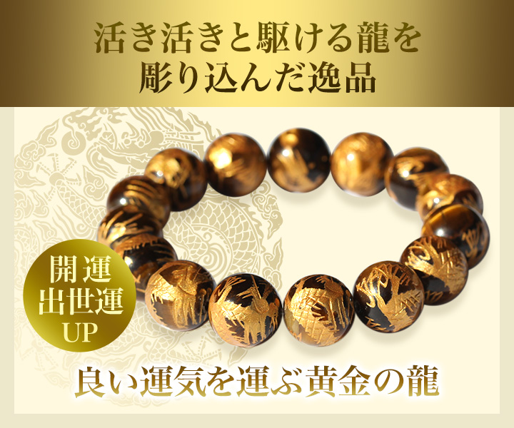 男性から絶大な人気を誇り、またパワーストーンとしても有名な石であるタイガーアイに、金色に輝く龍を彫り込んだビーズを使用した、素通しのブレスレットです。