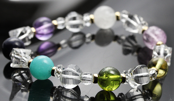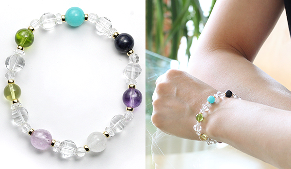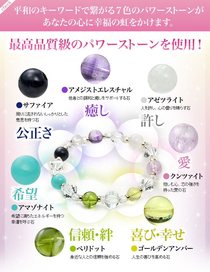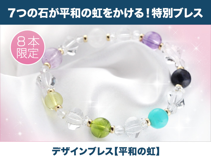 このように神聖さもある7という数字を基にして、7種類の石をあしらって作り上げたのが、このデザインブレス【平和の虹】です。