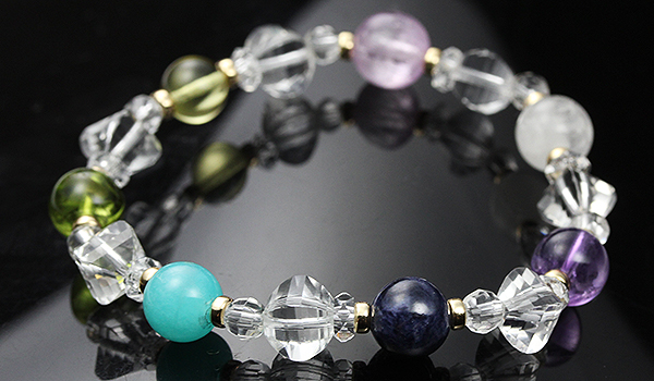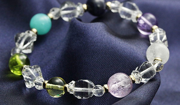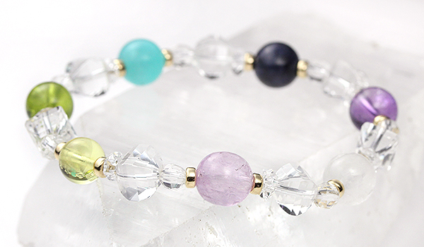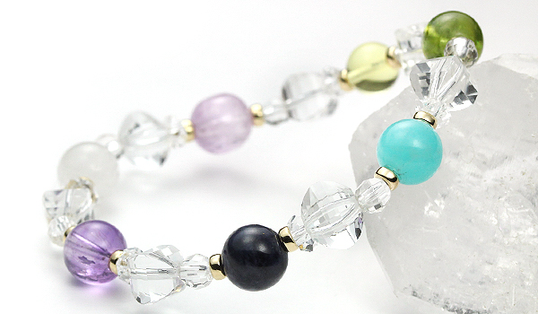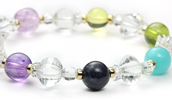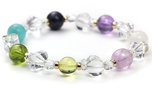 商品名:デザインブレス【平和の虹】(アメジストエレスチャルクォーツAAA・サファイアAA・ペルー産アマゾナイトSA・ペリドットAAA’・ゴールデンアンバー[黄金琥珀]・クンツァイトキャッツアイSA・アゼツライト)