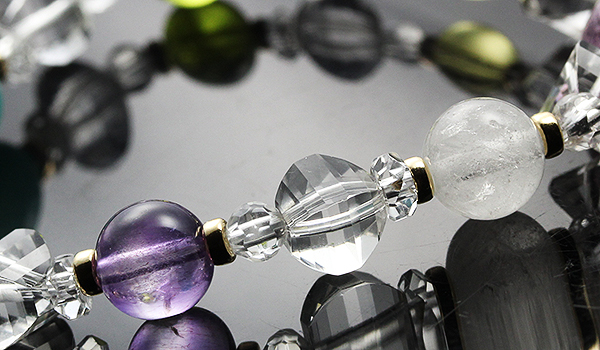 シリコンゴム0.8〜1.0mm、ドーナツビーズゴールド(ゴールドフィルド)、水晶平カット、水晶32面カット、水晶ピラミッドカット
