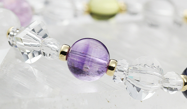 アメジストエレスチャルクォーツAAA8mm・サファイアAA8mm・ペルー産アマゾナイトSA8mm・ペリドットAAA’8mm・ゴールデンアンバー[黄金琥珀]7mm・クンツァイトキャッツアイSA8mm・アゼツライト8mm