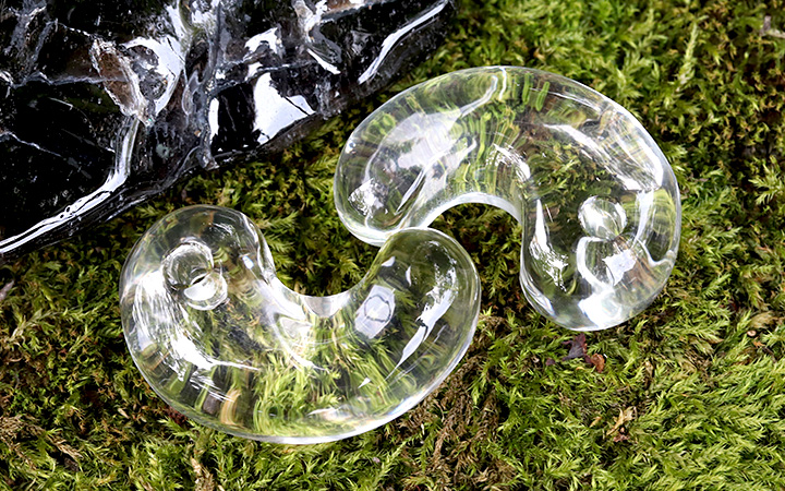 向こう側を透かしてみせる圧倒的な透明度の高さ、そして内側から光が溢れ出すようなうるうるとした艷やかな輝きに、思わず見惚れてしまうこと間違いなしの水晶の勾玉が