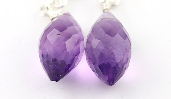 両端の尖った楕円形が印象深く、表面の細やかなファセットカットにより美しく煌めく、マーキースブリオレットカットのアメジストを使用したピアスです。