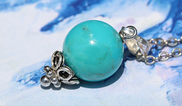 うっすらグリーンの色味が混じった、落ち着いたブルーの発色が美しいターコイズの10mm珠を使用した、1粒タイプのペンダントです。