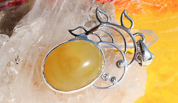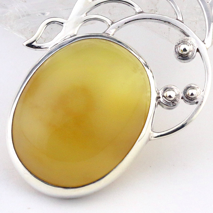 イエローオパールを引き立てる台座は、太陽のようでもあり、ヒマワリのようにも見えるシルバーの装飾。