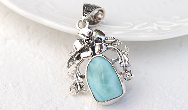 ラリマーを引き立てる台座は、立体的な花の装飾を上部に施し、そこからツルが伸びてラリマーを囲むようなデザインになっています。