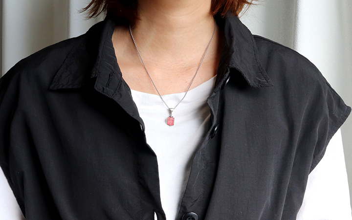 こちらのペンダントにセッティングしたインカローズは、ほのかにピンクやオレンジが混じり合ったような、美しくも可愛らしさもある鮮やかな赤色で、光に透かせば透明感も感じられ、ガラスのような艶めかしい光沢も美しいもの。