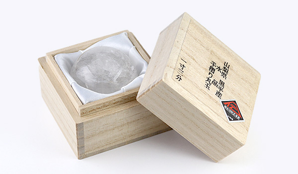 こちらの山梨県黒平産水晶丸玉は桐箱にお入れしてお届けし、丸玉と同じ山梨県黒平産水晶の原石で作られた