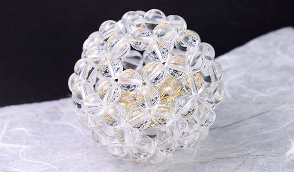 無色透明の美しい輝きを放つ水晶を”バッキーボール”の形に編み込んで、その内部に神聖幾何学の一つである”フラワーオブライフ”のプレートを入れた、