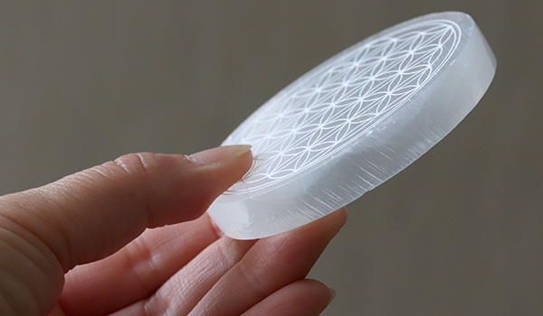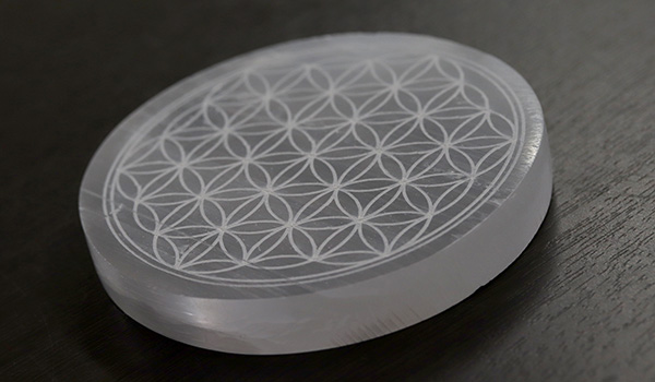厚さのあるモロッコ産セレナイトのプレートに、フラワーオブライフの刻印を施したアイテムです。