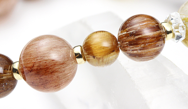 今回のVer.4では、9.5〜10mmのタイチンルチルクォーツと、9mmのエンジェルヘアーレッドルチルクォーツを、3珠ずつポイントにあしらいました。