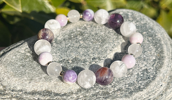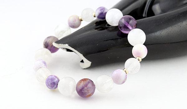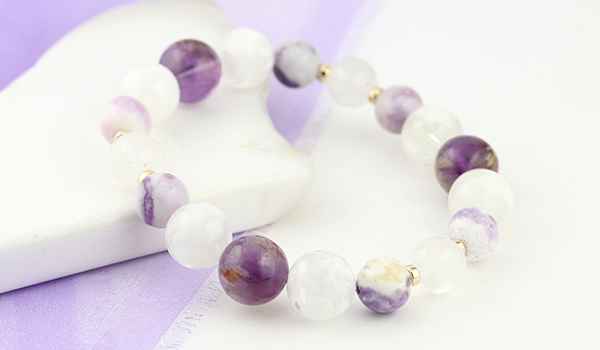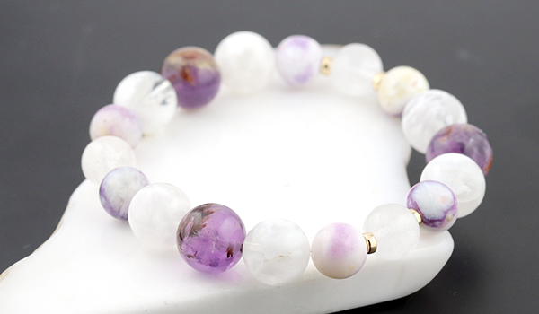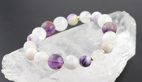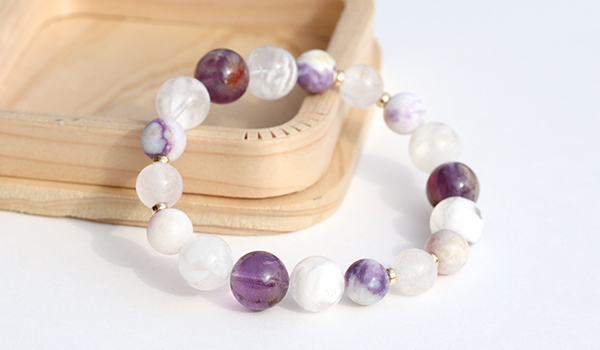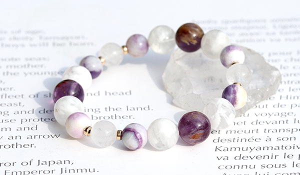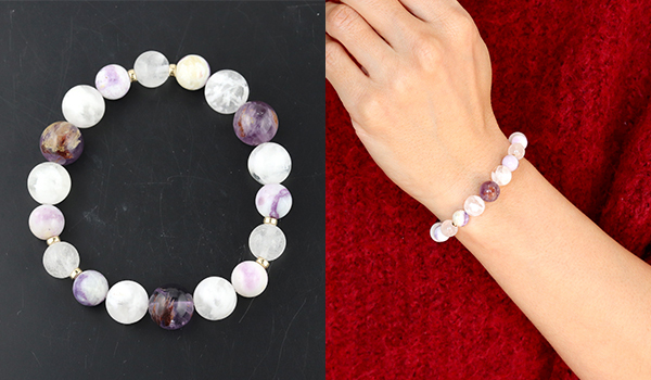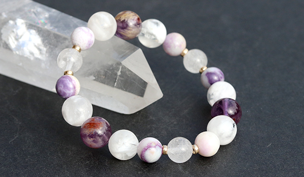 このブレスレットはガーデンアメジスト、セリサイトインクォーツ、ティファニーストー、