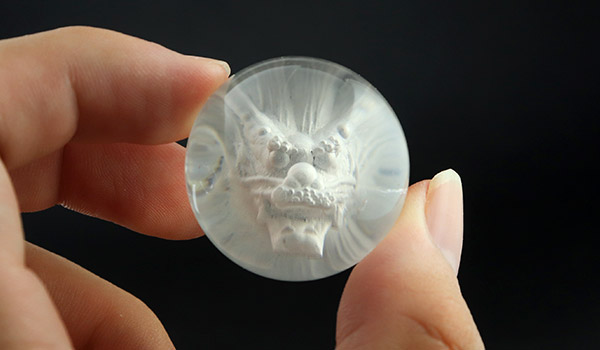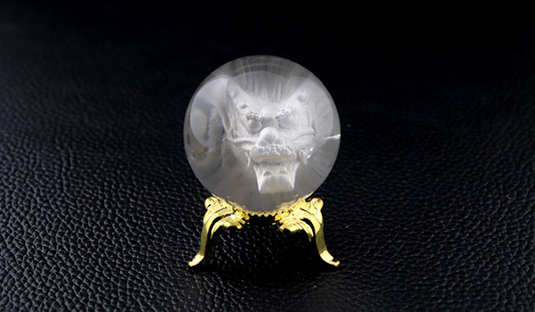 水晶玉の正面から見ると龍の顔の正面が見えるのですがその立体感と迫力は凄まじく、水晶玉いっぱいに広がります。