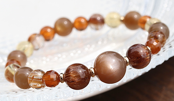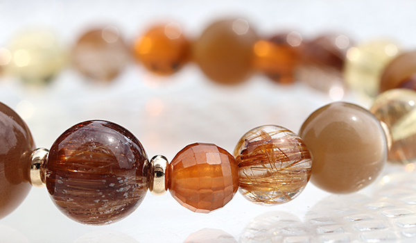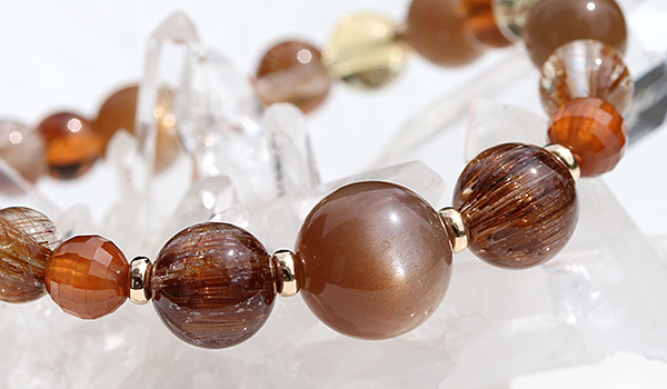 また、ルチルクォーツもスタンダードなゴールドカラーのものではなく、大変希少価値の高いオレンジルチルクォーツや、キャッツアイの輝きを持つブラウンルチルクォーツをセレクト。