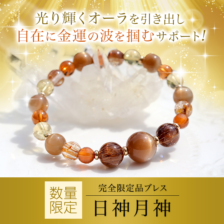 完全限定品ブレス【日神月神(にっしんげっしん)】は、5種類の強力な金運石を厳選して組み合わせた、金運を呼び込み豊かさを引き寄せるための特別なブレスレットです。