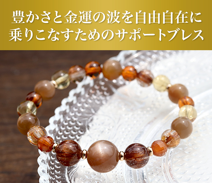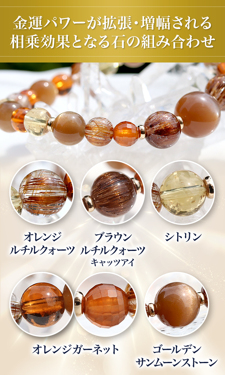 サンムーンストーンをサポートし、あなた自身のエネルギーや金運の流れを拡張・増幅させる、選び抜かれたパワーストーンたち