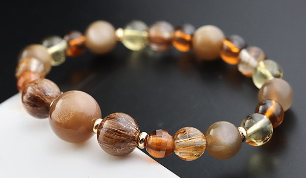 「他の人が持っていないような、新しい金運ブレスを作りたい!」という想いから生まれた【日神月神】は、市場にあまり出回らない希少石であるゴールデンサンムーンストーンをメインに取り入れました。