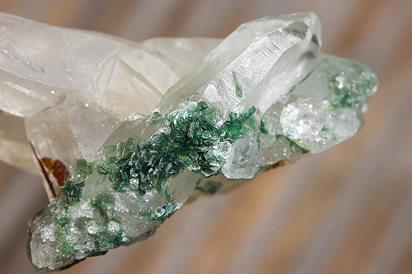 まるで水晶ポイントを包み込むように存在するフックサイトの結晶は、大地を包み込む植物の緑を想像させます。