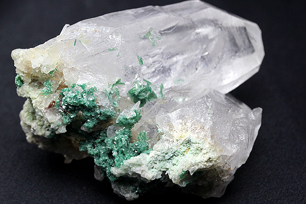 その鮮やかな緑色のフックサイトと水晶とのコントラストが絶妙で大自然を思わせる色合い。