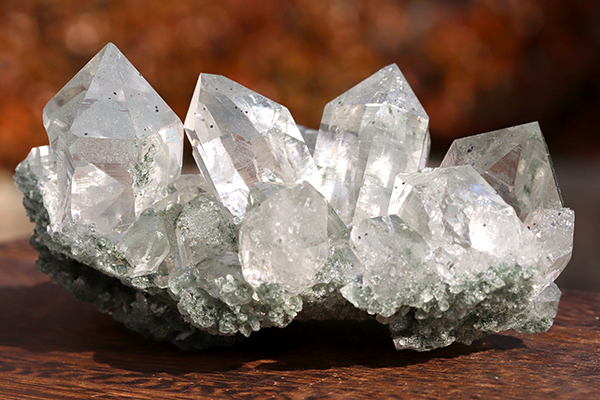 底面部には深い緑色のクローライトが一面に付着し、ワイルドな雰囲気もお楽しみいただけます。
