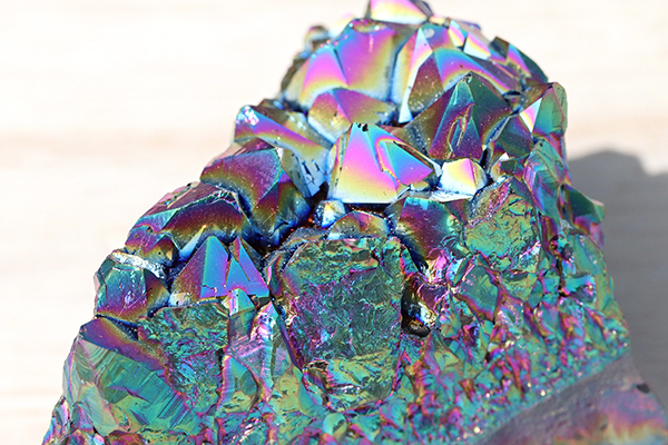 水晶クラスターを真空内で熱し、高温に熱しイオン化したチタンと他の微量な金属成分を蒸着して作られたものをブラックアクアオーラ水晶といいます。