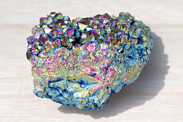 水晶クラスターを真空内で熱し、高温に熱しイオン化したチタンと他の微量な金属成分を蒸着して作られたものをブラックアクアオーラ水晶といいます。