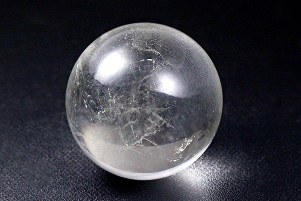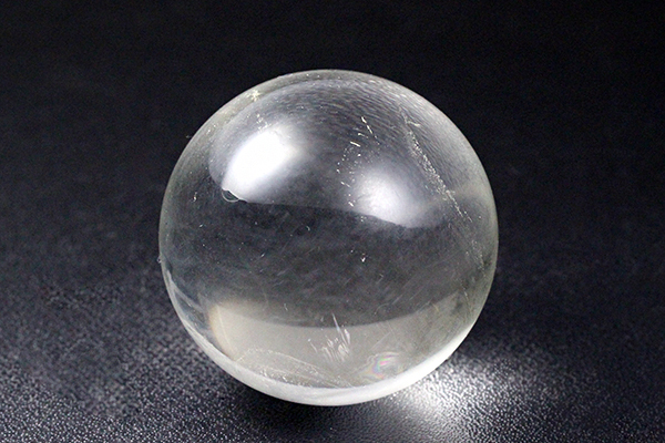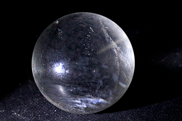 一見すると透明度が高い良質な水晶丸玉ですが、こちらの丸玉は普通の水晶玉ではありません!強い光を当てると・・青白い幾筋もの線が現れます!このような水晶を「ブルーエンジェルラダー水晶」と呼びます。