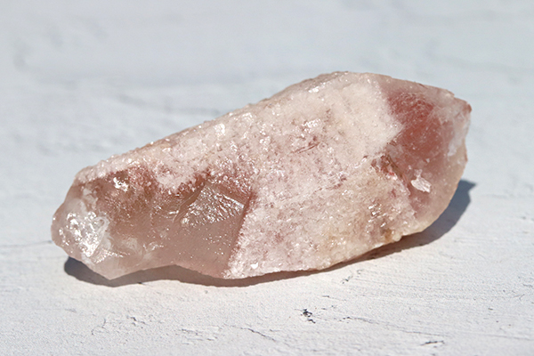 内部は、鉄分(ヘマタイト)によってピンク色に色づいており、表面が白や一部薄茶色に色付いた水晶に覆われ砂糖菓子のような雰囲気が愛らしい二層のクリスタルです。