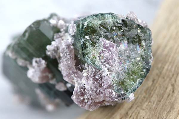 トルマリンの表面にはメタリックなパープルカラーのレピドライトが星屑を散りばめたように幻想的に共生しています。